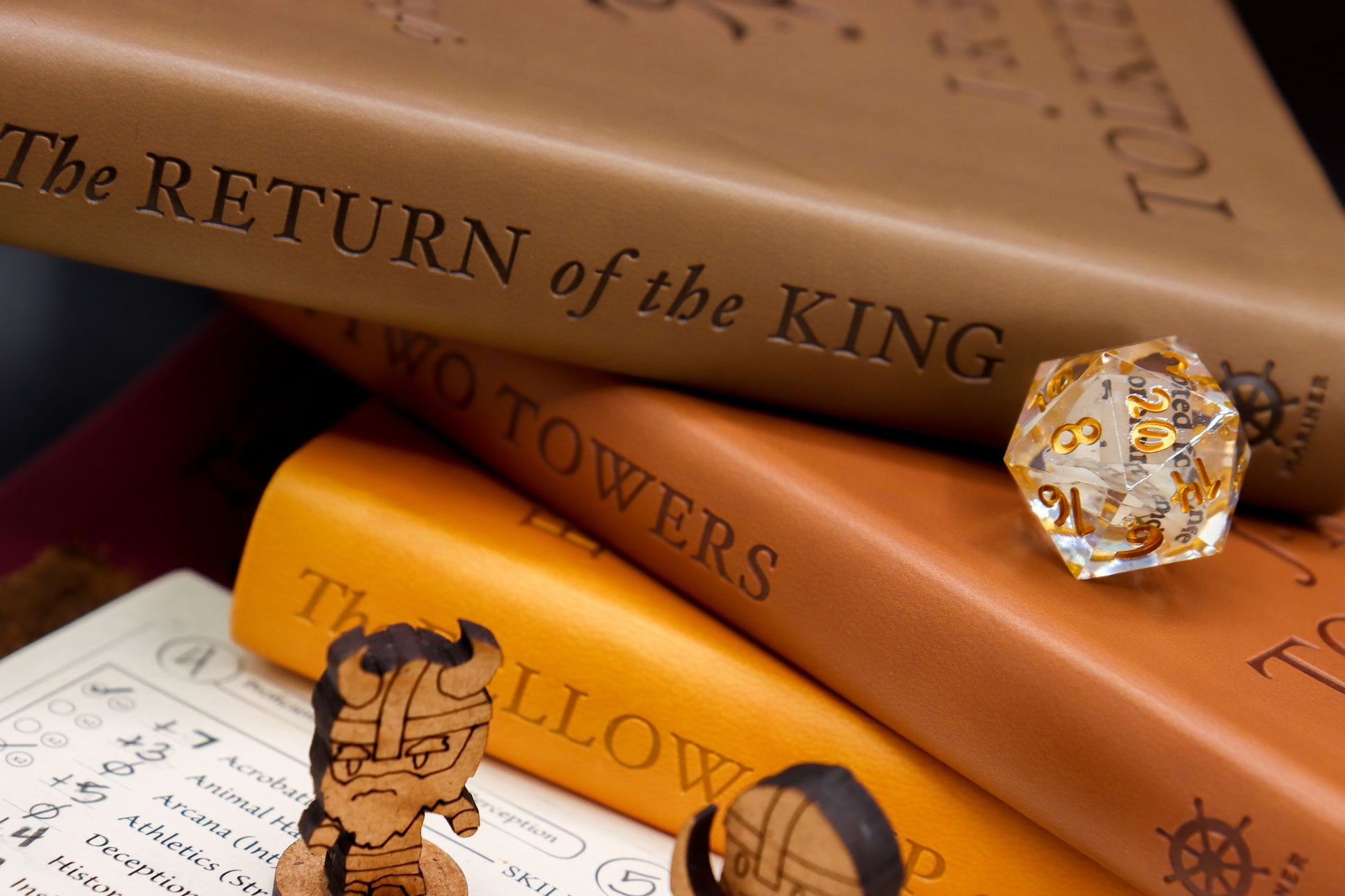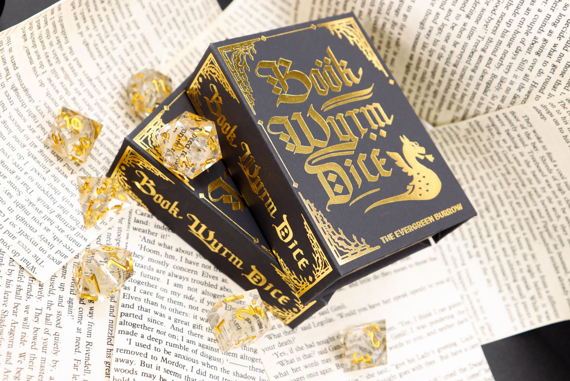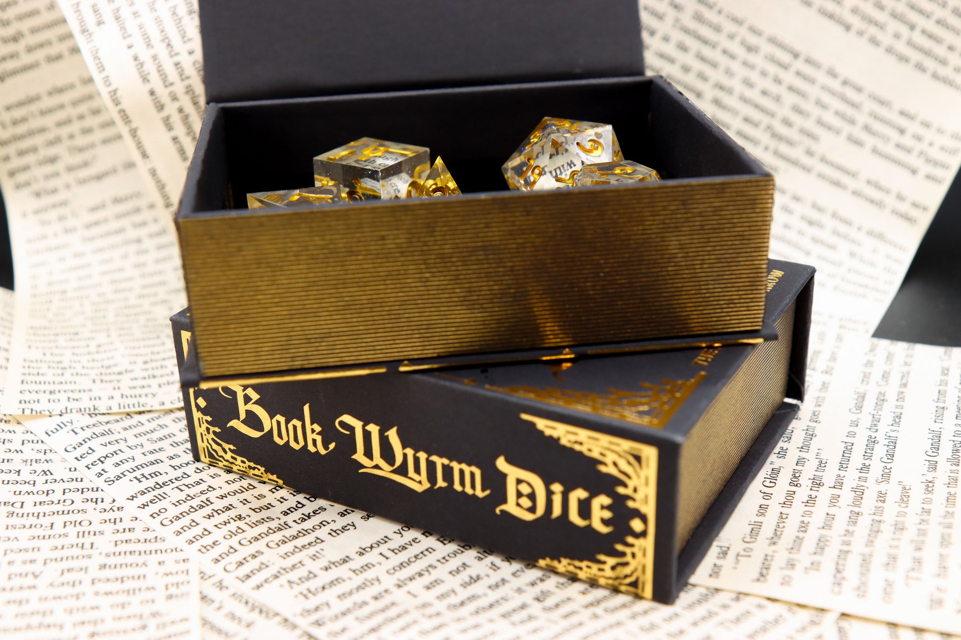 Created during our Kickstarter, these Book Wyrm dice evoke a sense of wonder and mystery. Filled with actual book pages from Lord of the Rings, each set comes in a specially designed Book Wyrm Book Box.