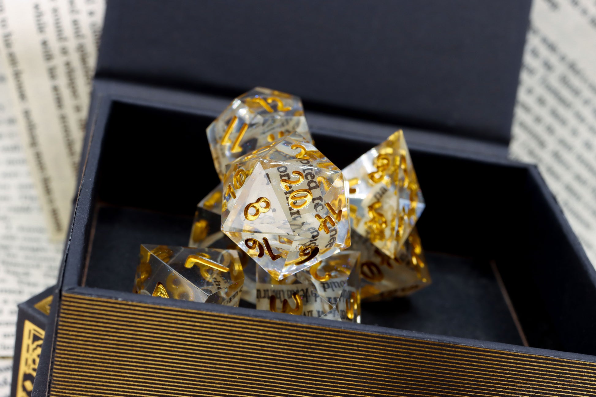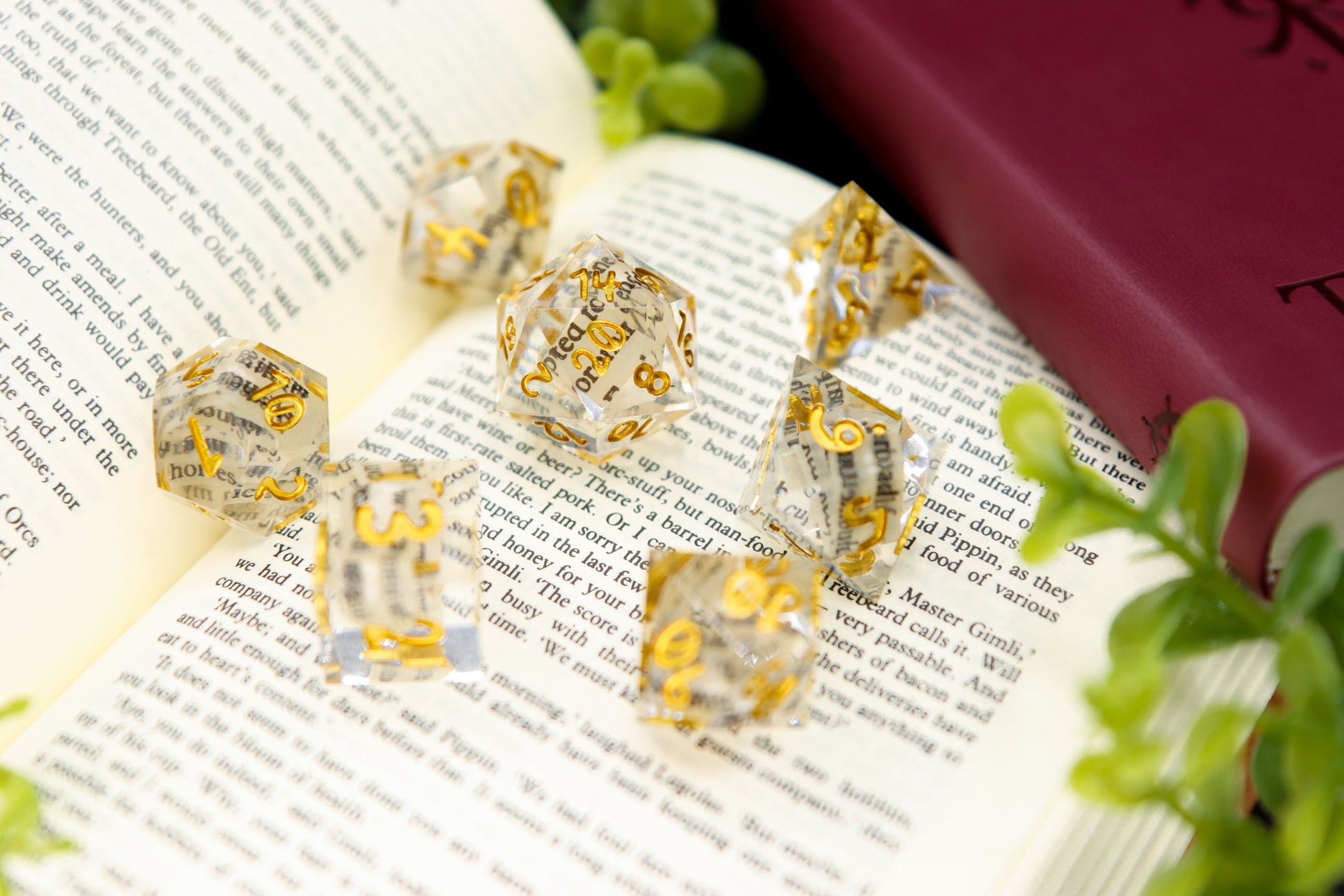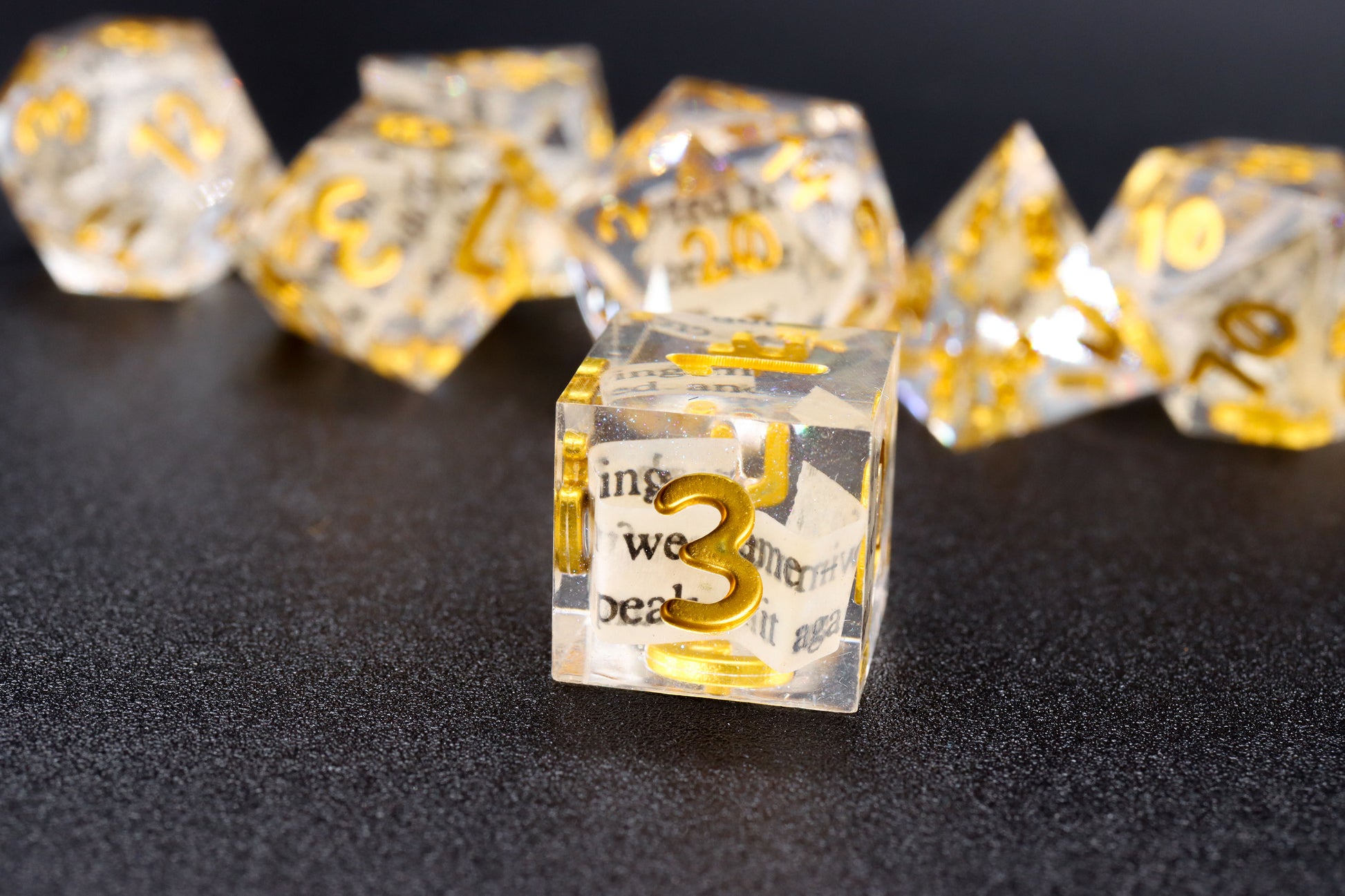 The greatest dragon hoard is knowledge, and its guardian is the Book Wyrm. A treasure trove of books, a lifetime of literacy- the Book Wyrm is the keeper of the chronicles, and now- so are you! These are sharp edge dice sets that have actual book pages embedded in shimmery resin- dice fit to tell incredible stories. All the book pages we use are upcycled from damaged or secondhand copies so we can give a second life to these stories.