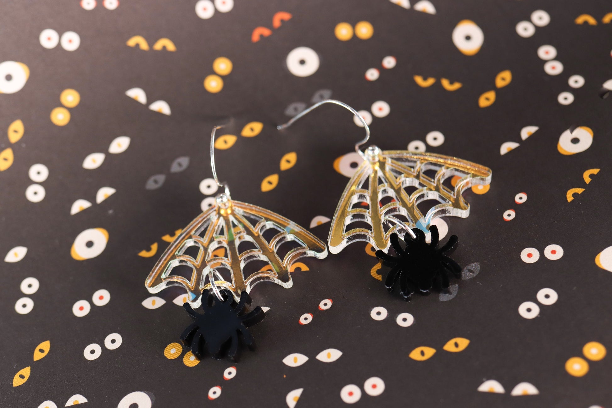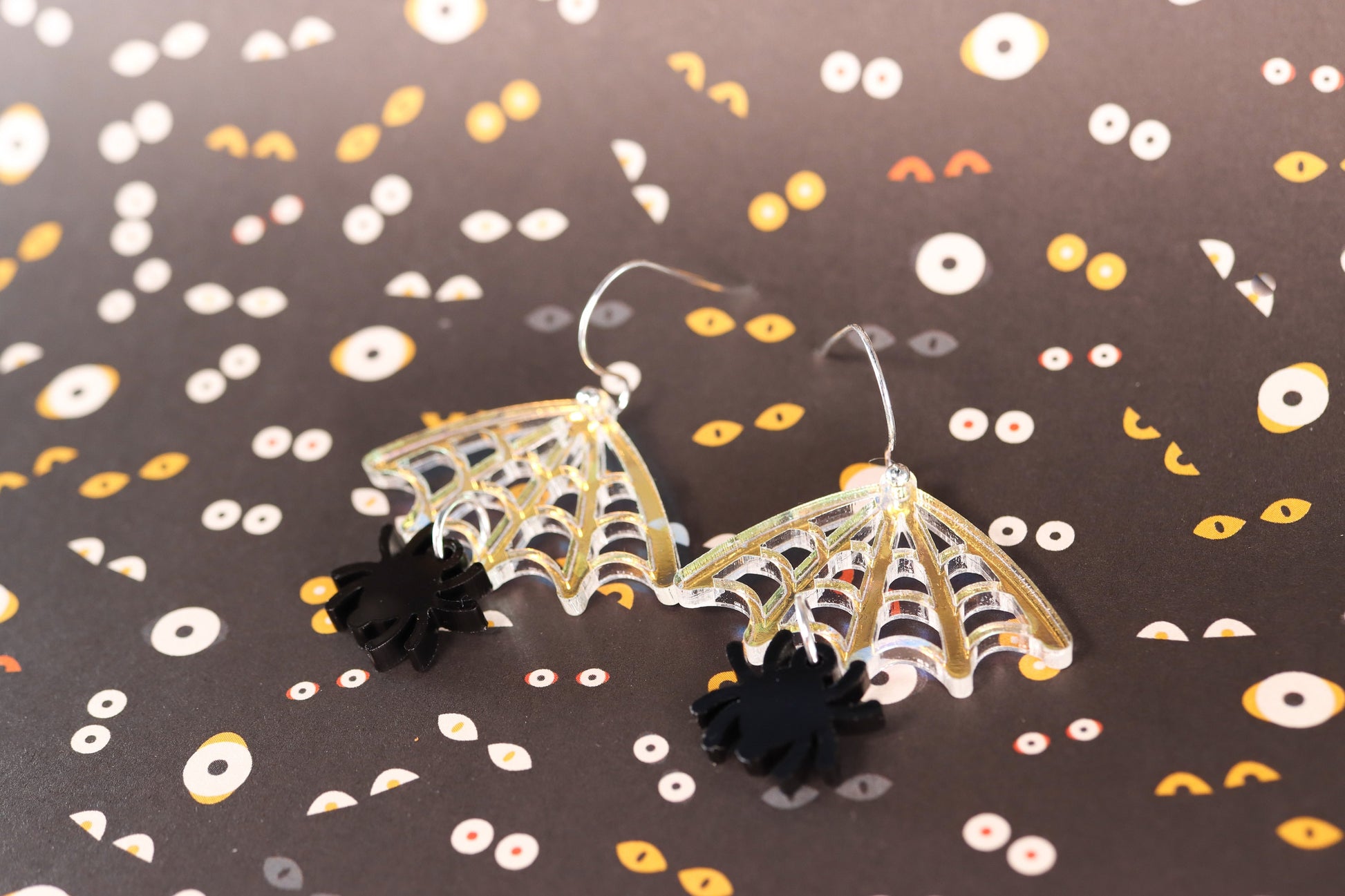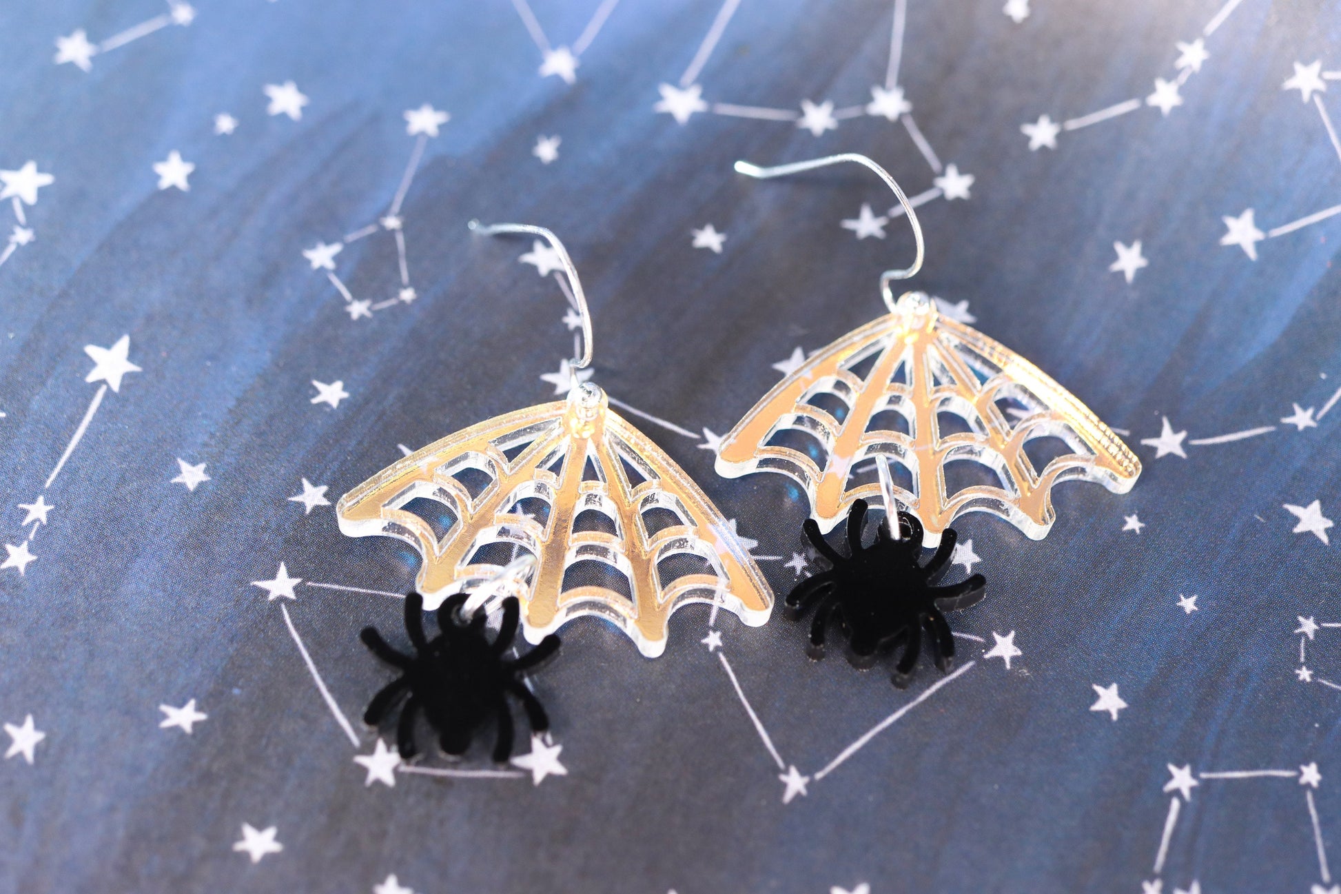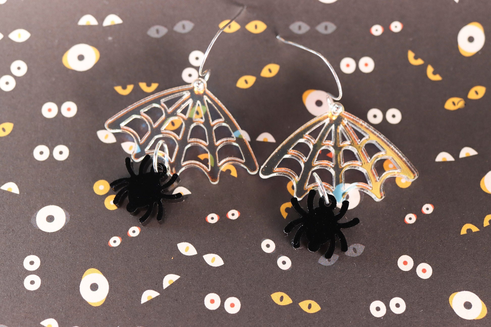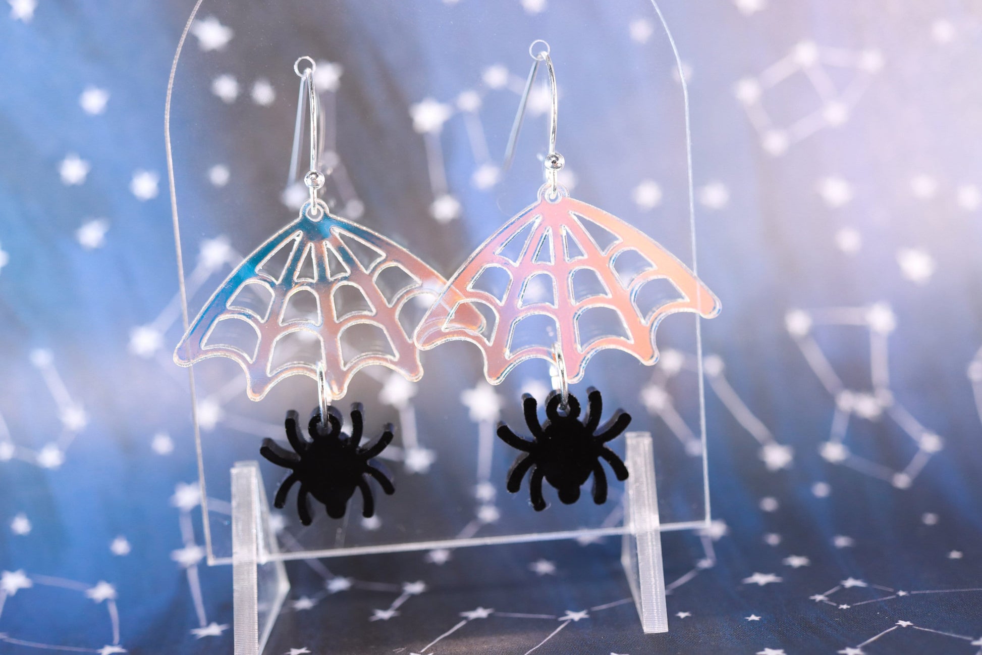 Holographic cobwebs dangle from silver plated ear wires in these adorable spooky earrings! A tiny spider dances and dangles on the end of the web, making these a cute witchy accessory!