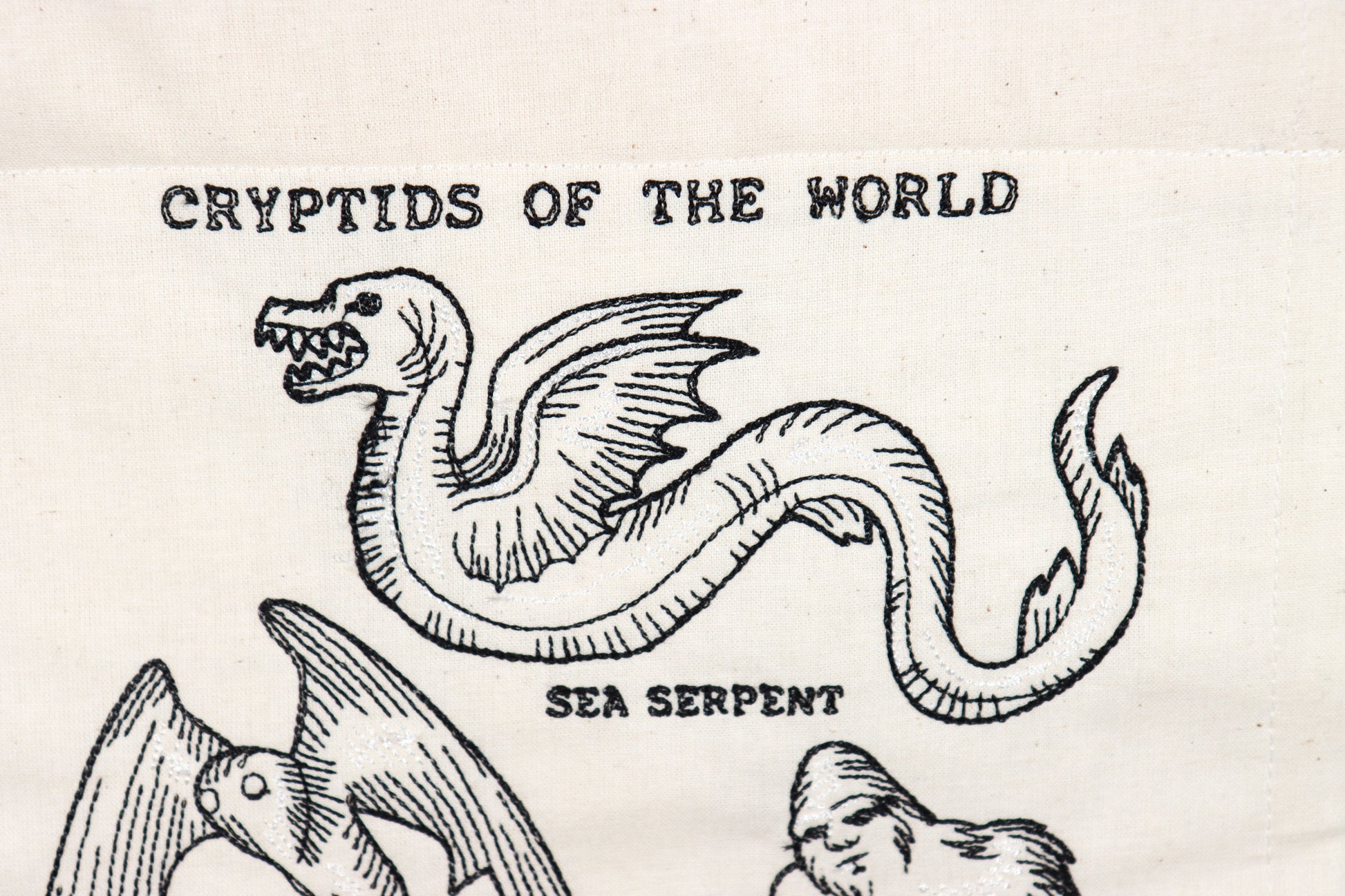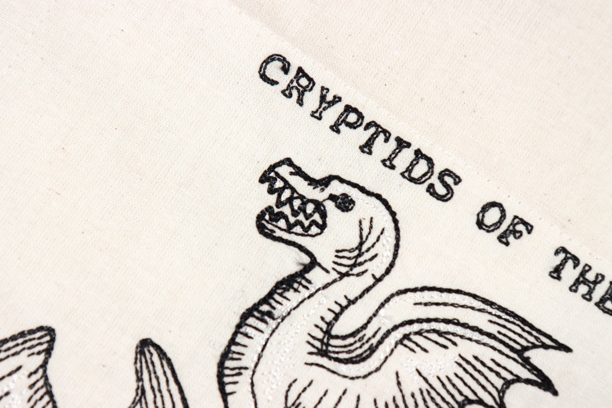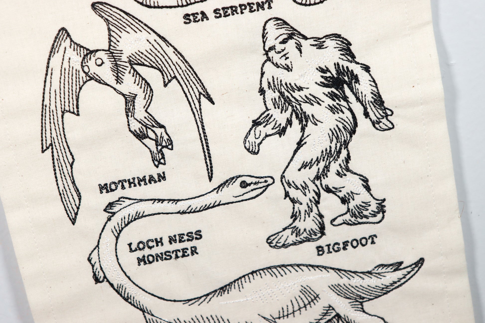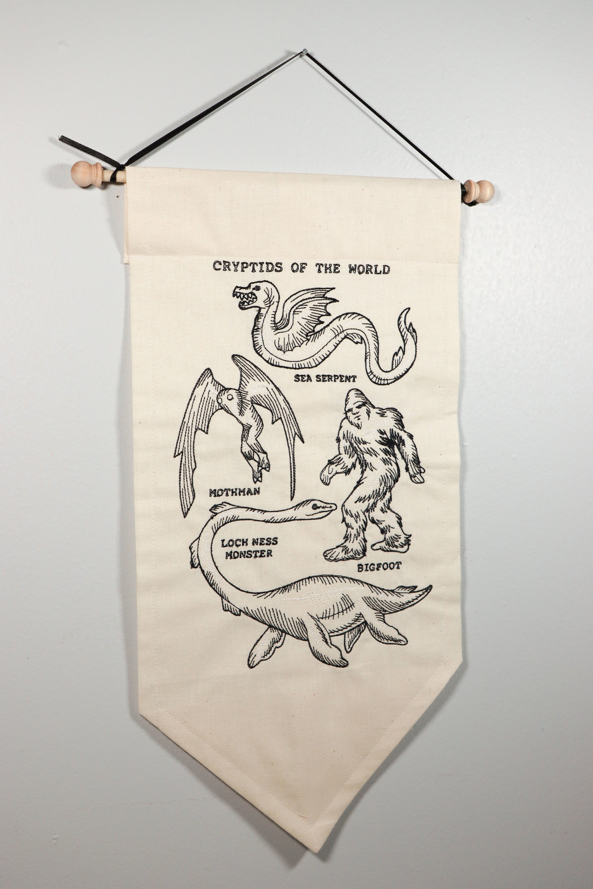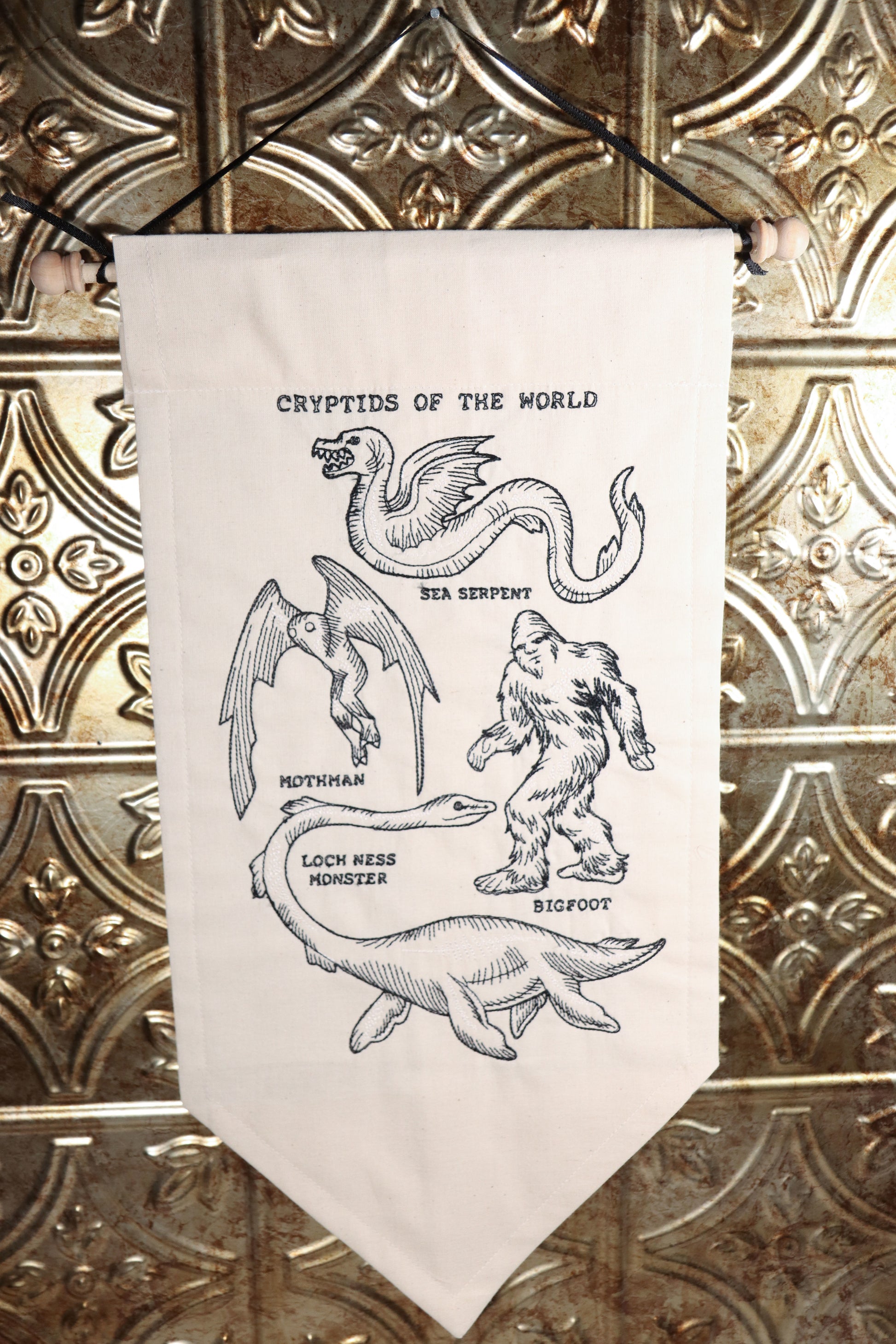 You won't have to hunt hard for these cryptids- this informative design puts them right on your wall! Our Cryptids of the World banner is embroidered on high-quality cotton with white and black color-fast thread, and measures 9 in x 18 in. It comes ready to hang with a dowel and ribbon, and is the perfect decor for the cryptid lover in your life.