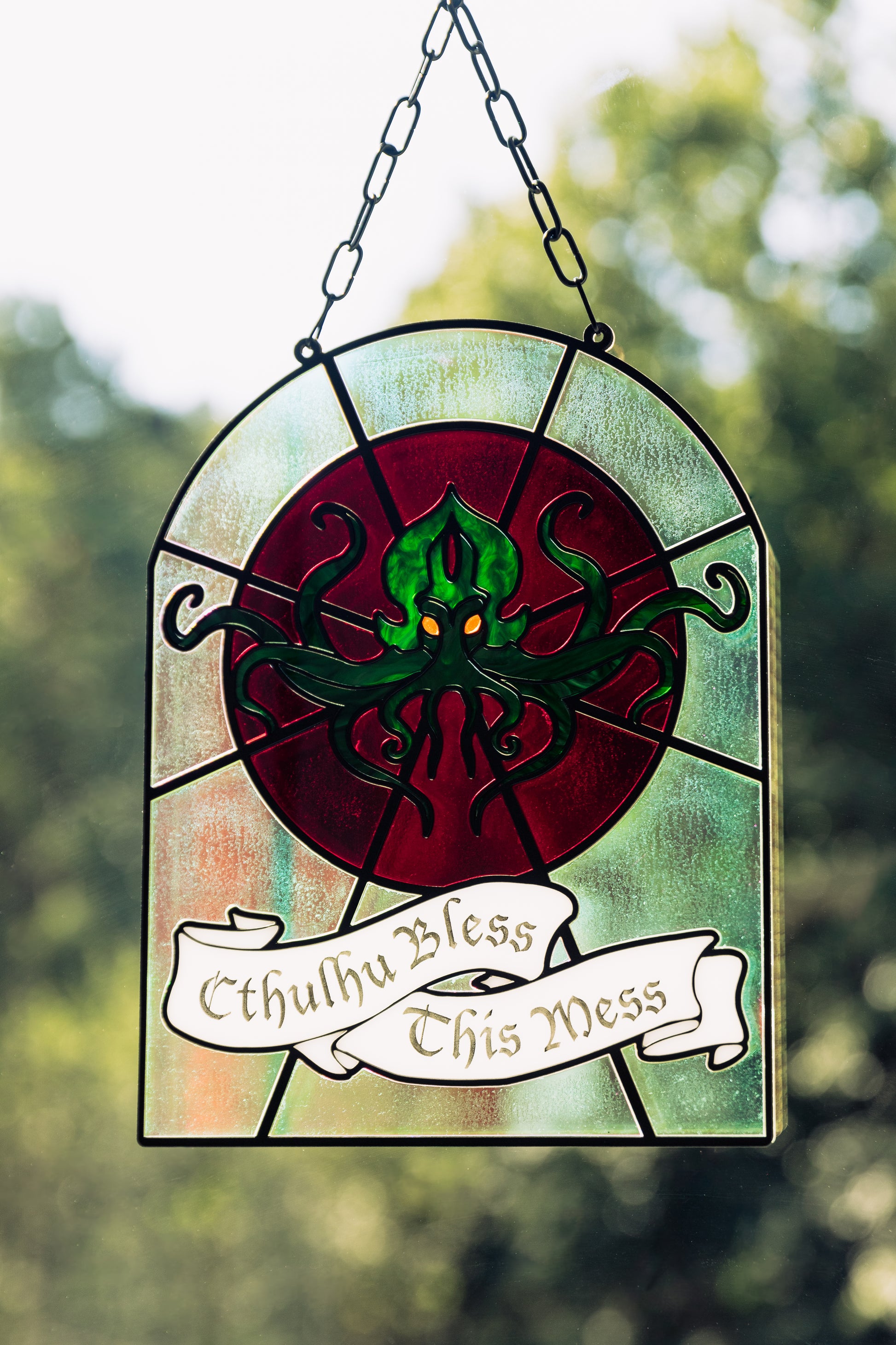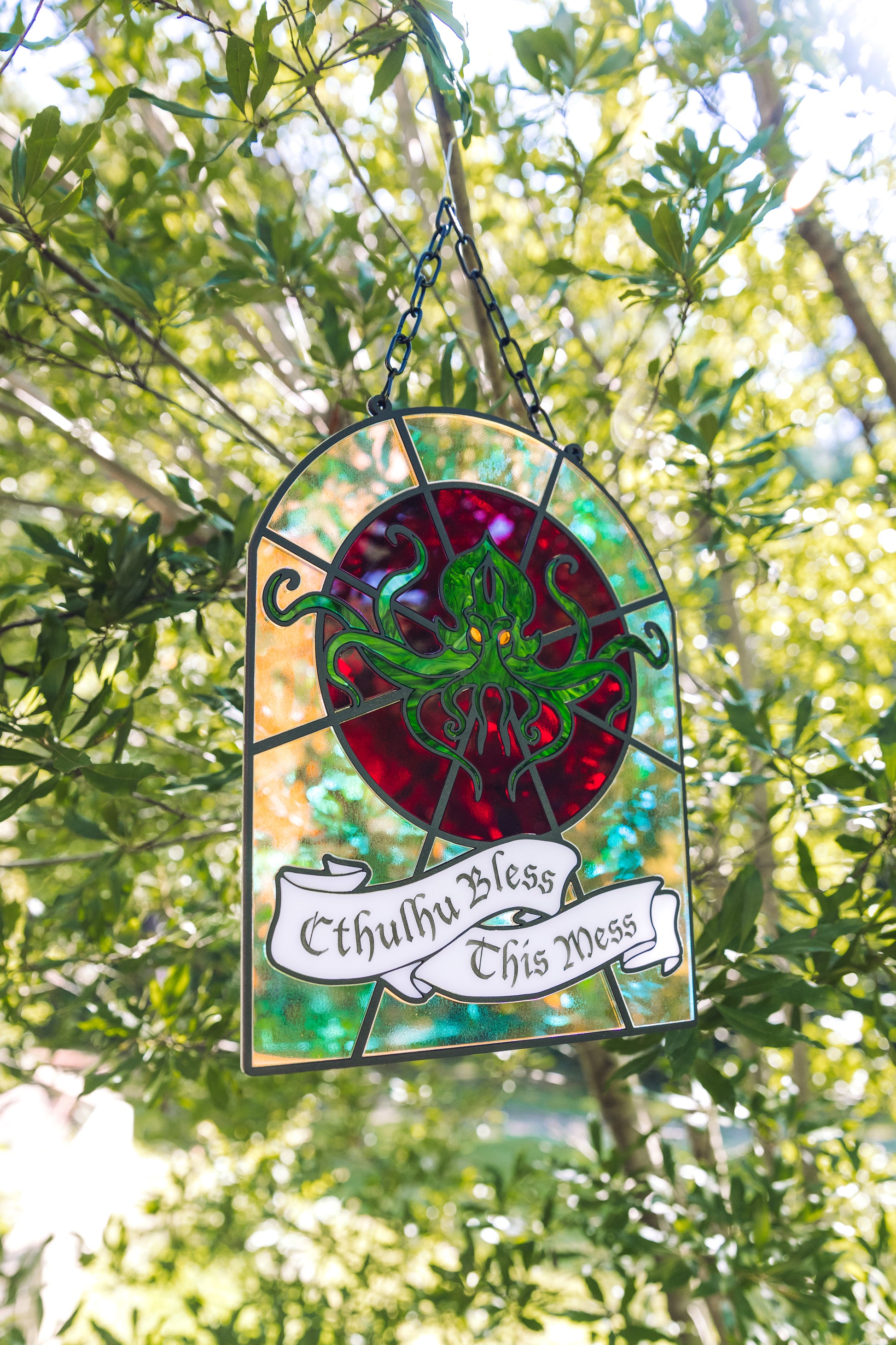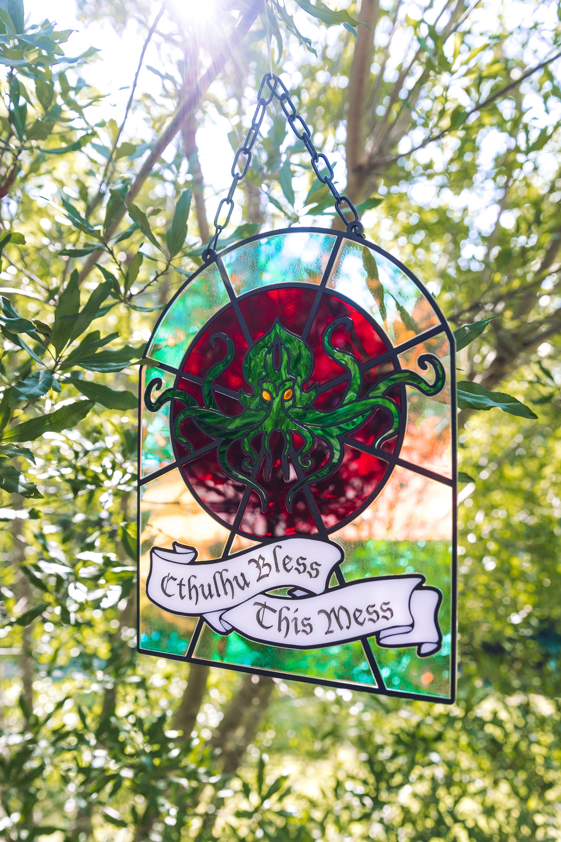 Crafted from multiple colors and textures of acrylic, this Cthulhu themed suncatcher is the perfect housewarming gift before an apocalypse! This piece of art is made from acrylic, not glass, so it is less fragile and much lighter, while still having a classic stained glass feel! Hang it in your window for a kitchy but foreboding warning, or above your fireplace as the centerpiece of your castle- it fits perfectly wherever you call home.