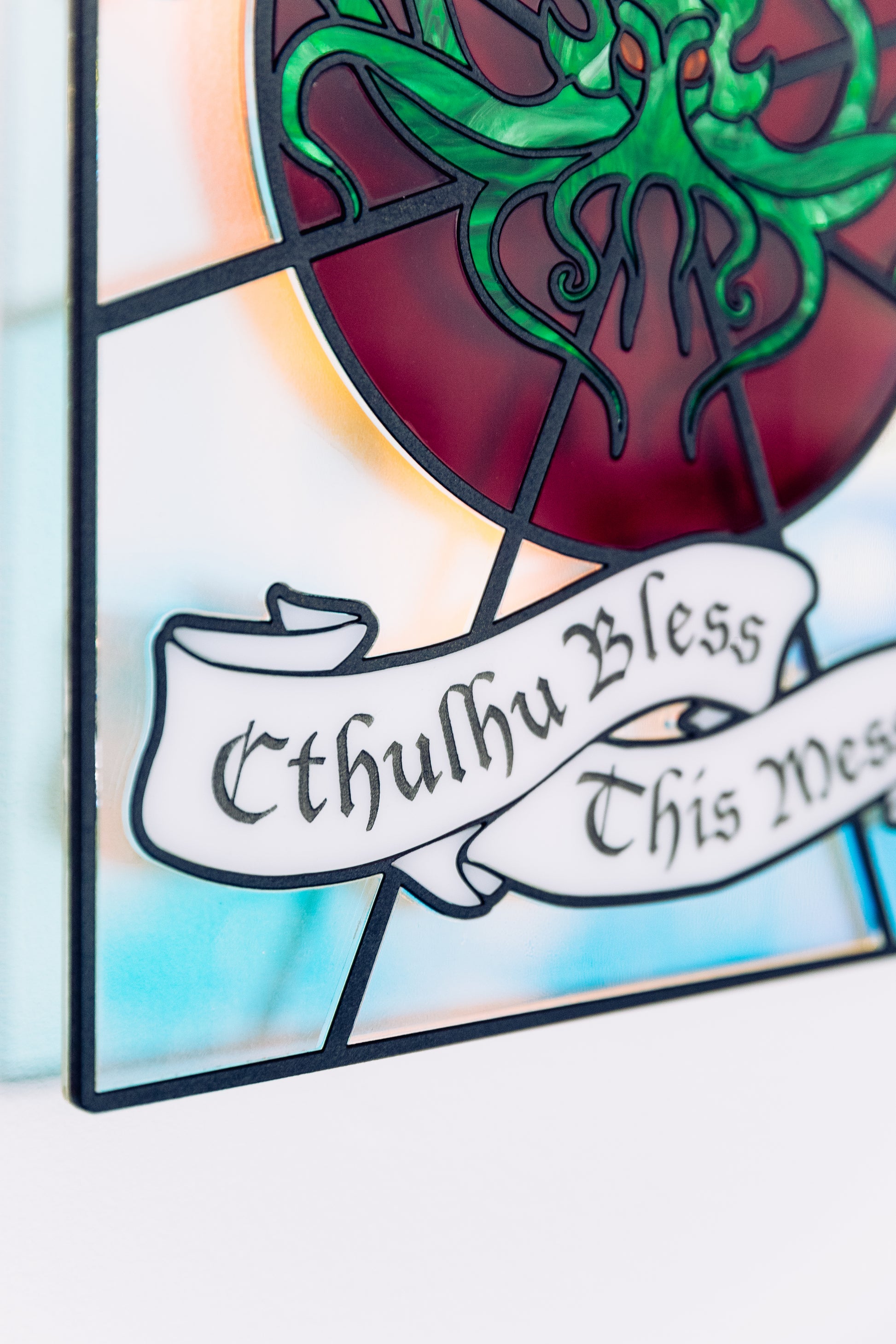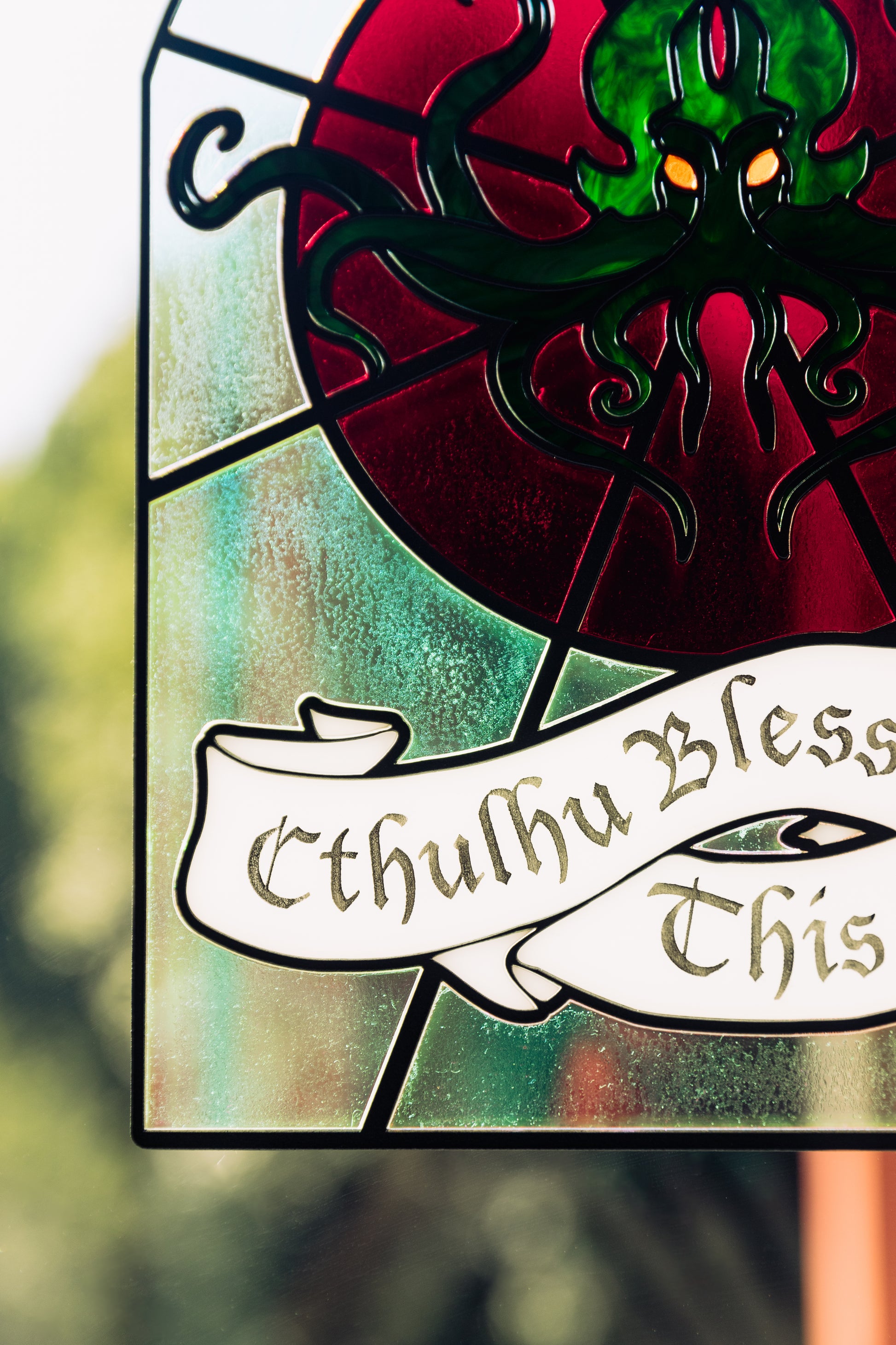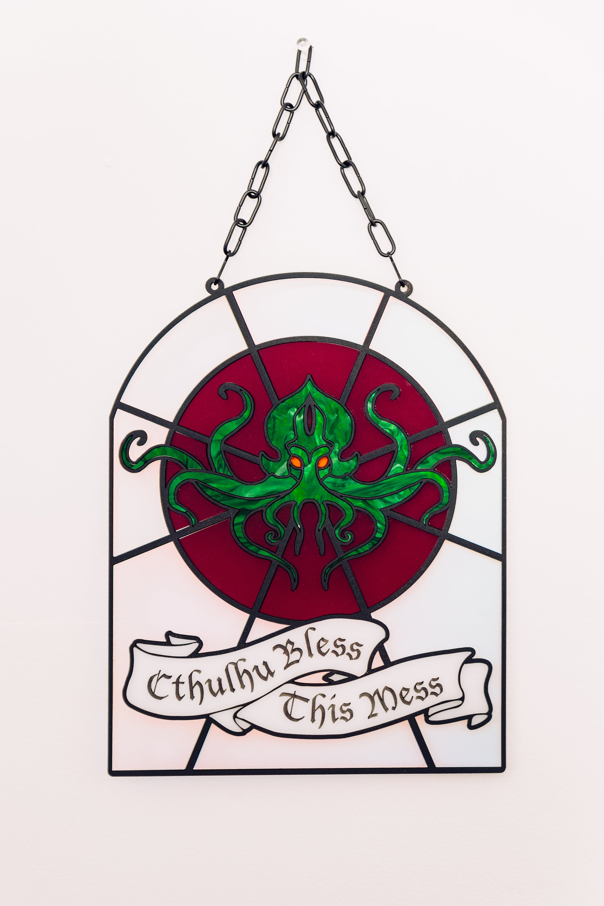 Crafted from multiple colors and textures of acrylic, this Cthulhu themed suncatcher is the perfect housewarming gift before an apocalypse! This piece of art is made from acrylic, not glass, so it is less fragile and much lighter, while still having a classic stained glass feel! Hang it in your window for a kitchy but foreboding warning, or above your fireplace as the centerpiece of your castle- it fits perfectly wherever you call home.