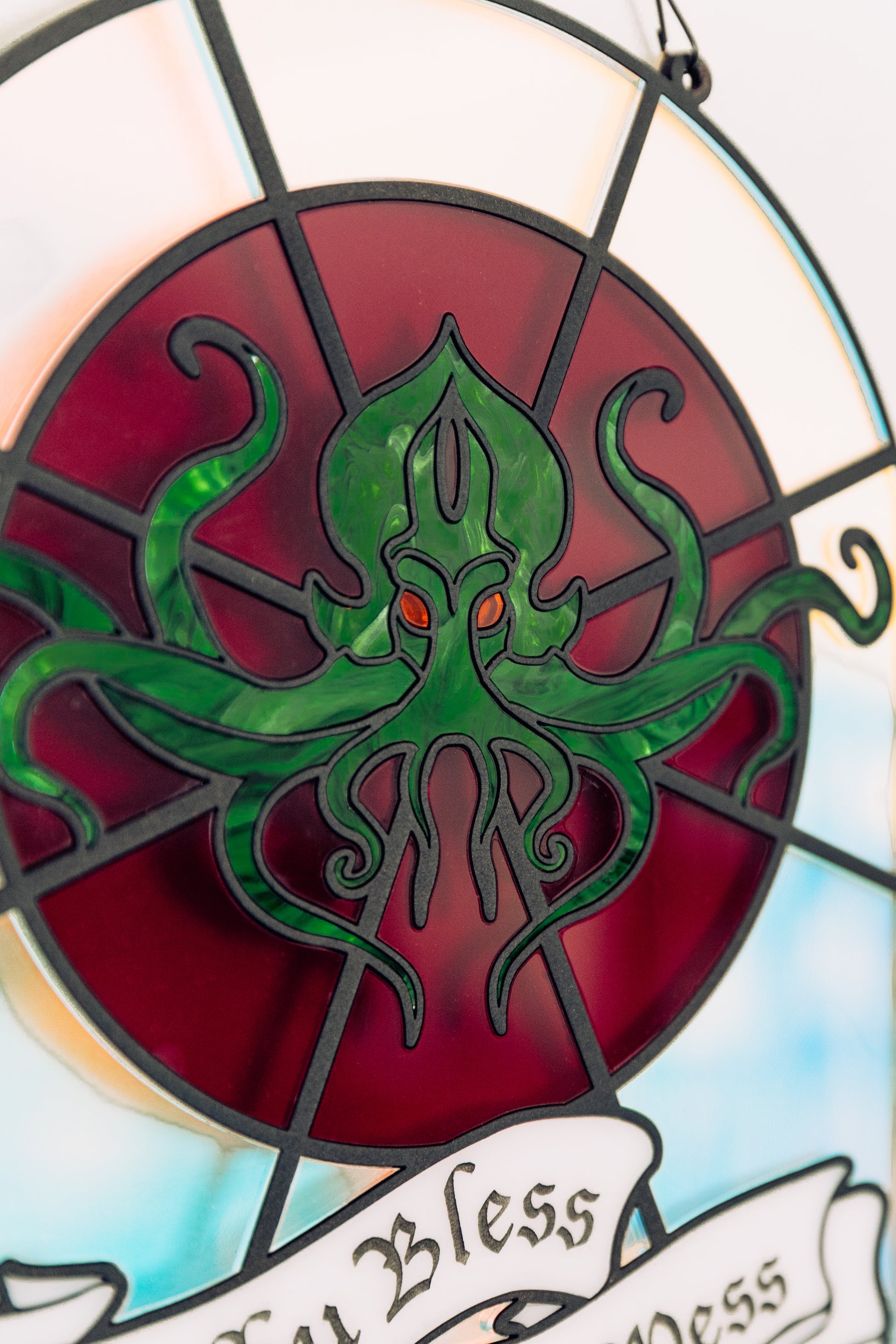 Cthulhu stained glass measures 7 inches x 11 inches and comes ready to hang on a classic black chain.