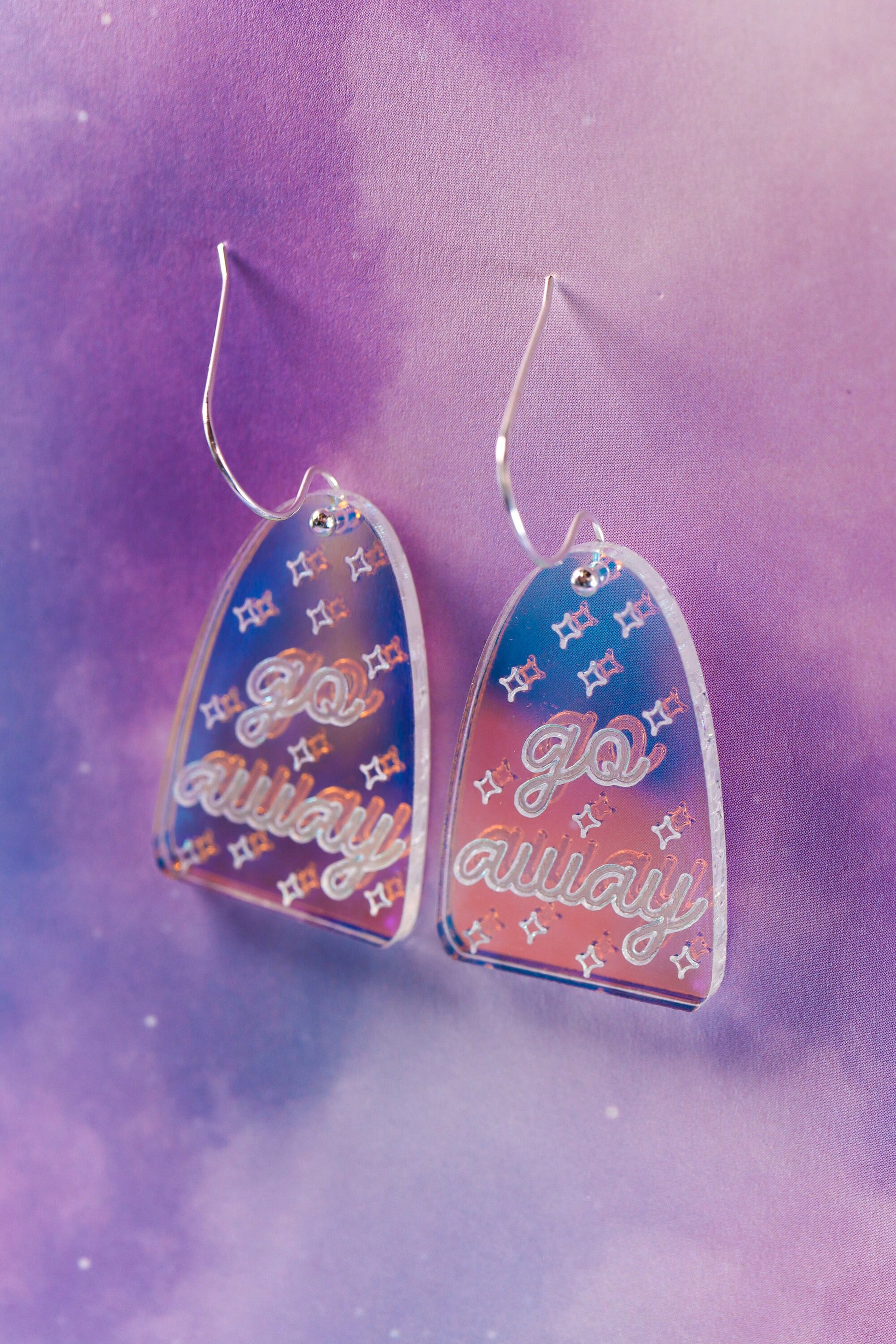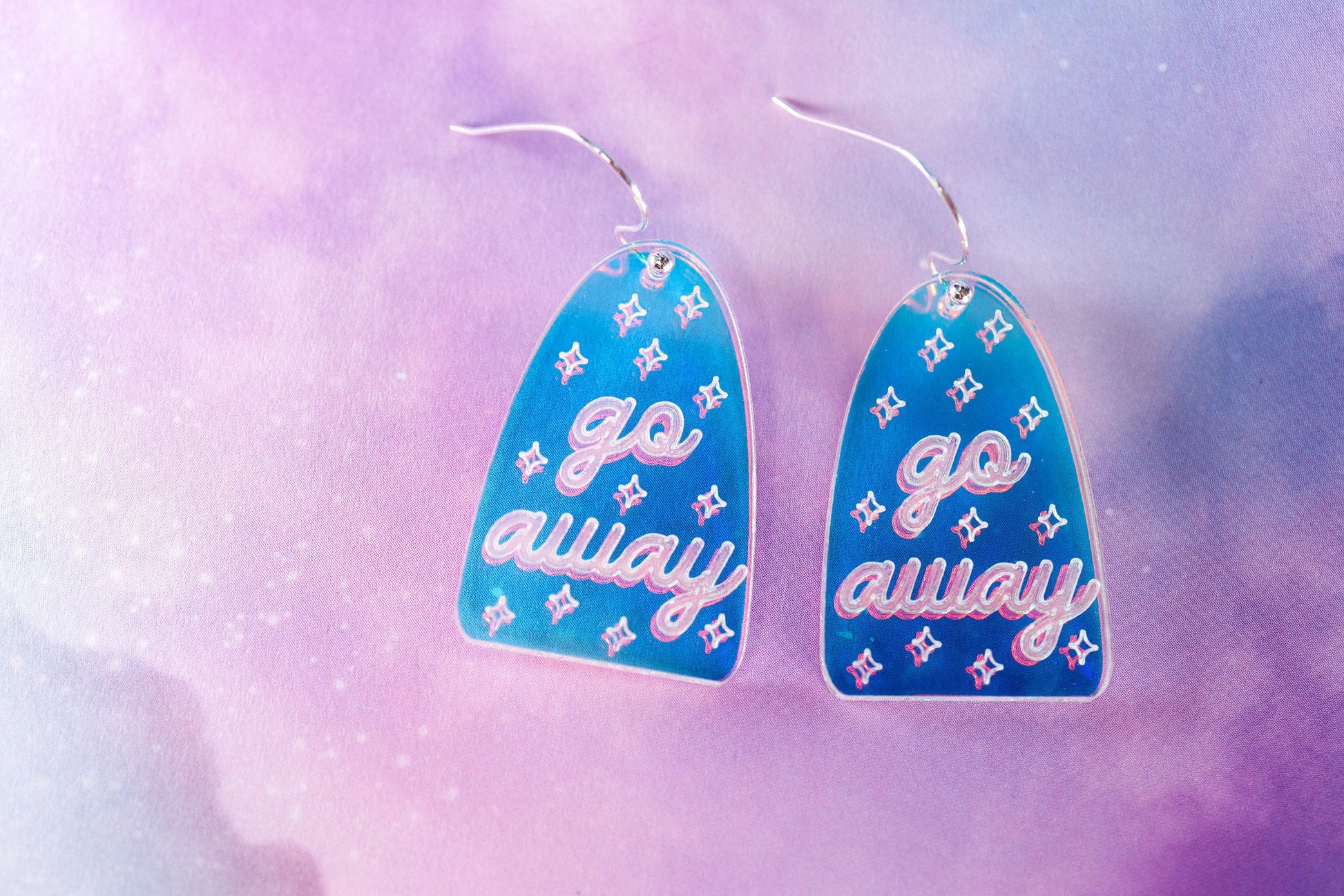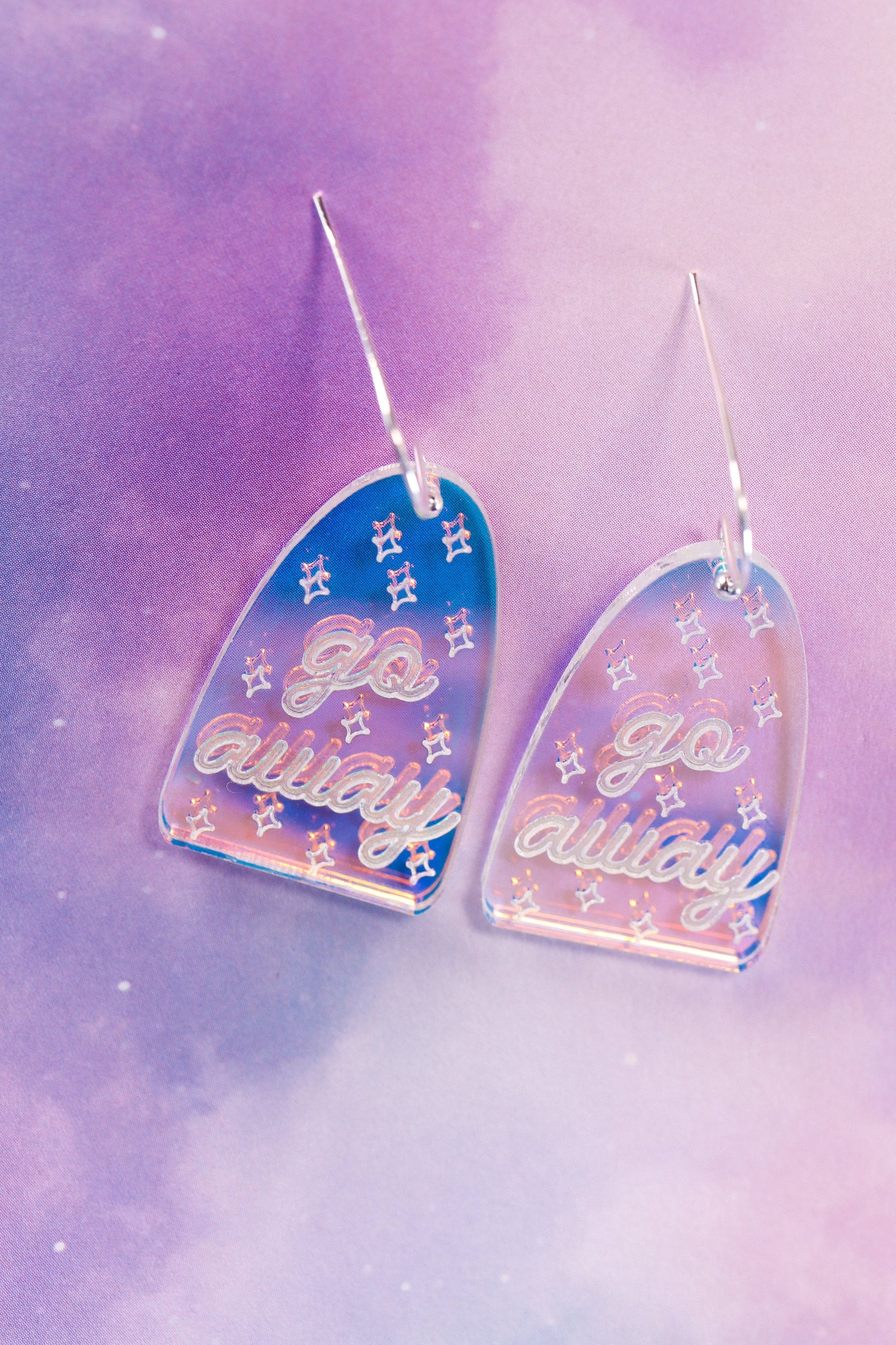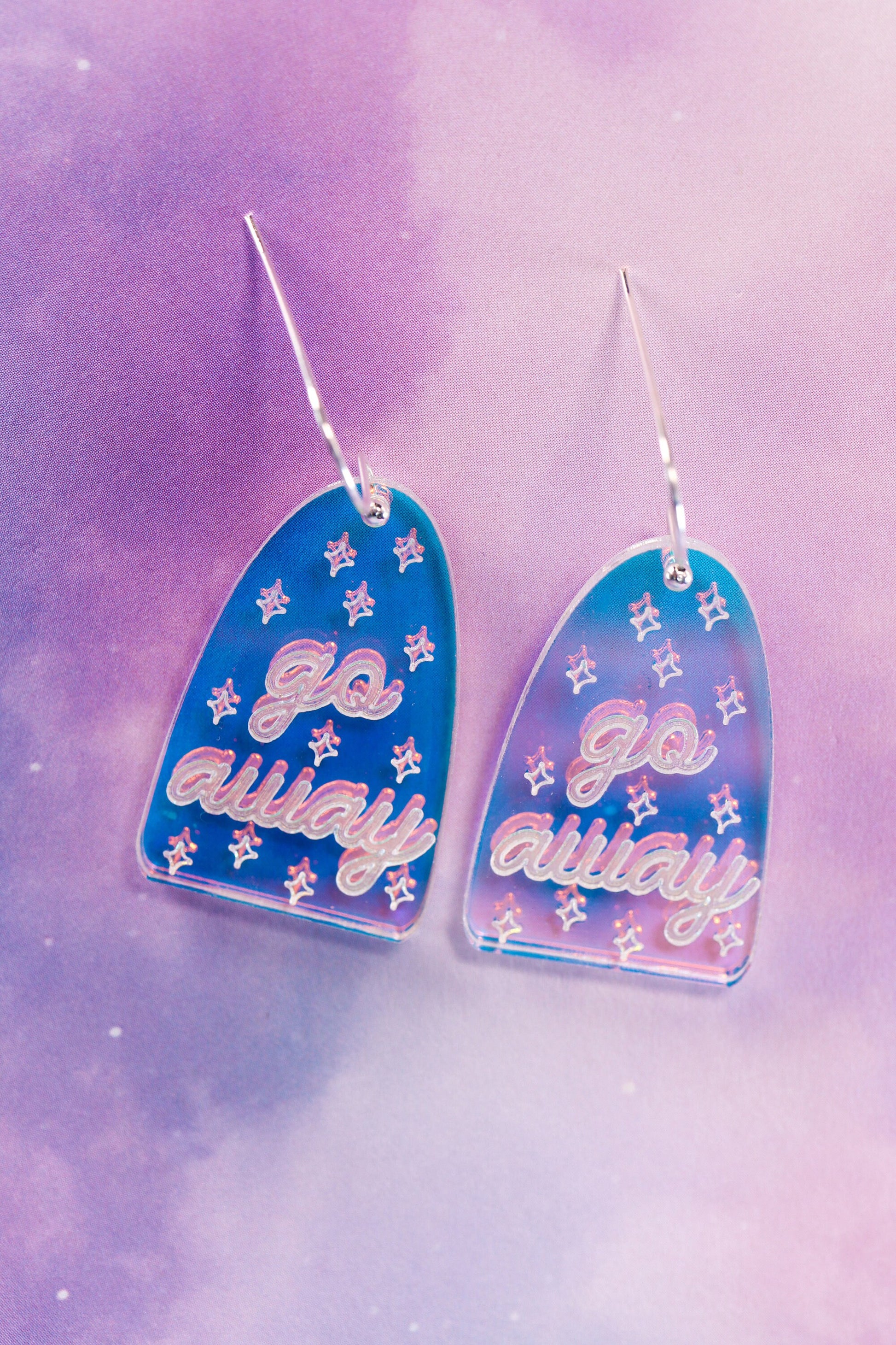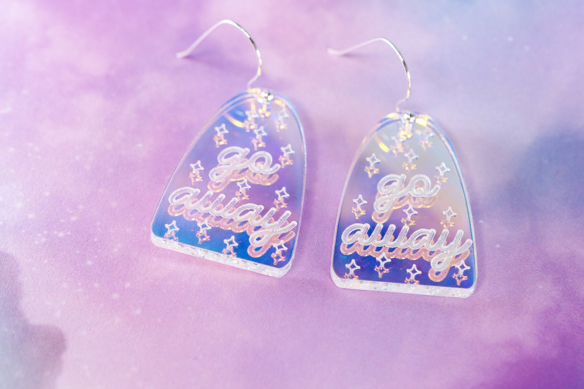 Want to make your feelings known about any unexpected visitors? Unplanned phone calls? Company past 9 pm? These earrings are the perfect statement piece! Holographic acrylic is engraved with "go away" and cute star shapes.