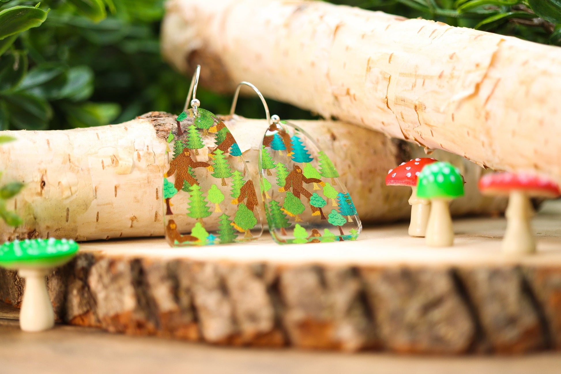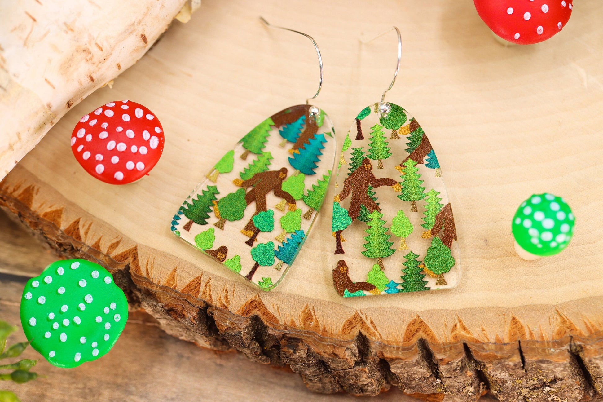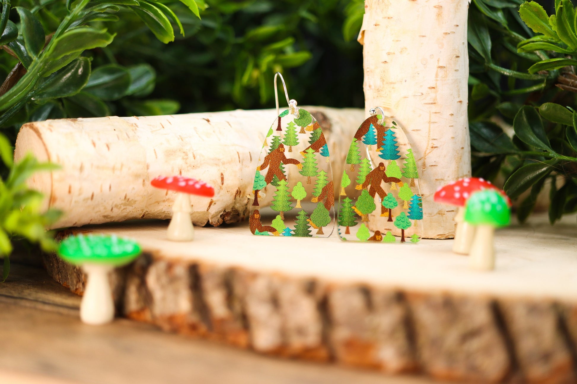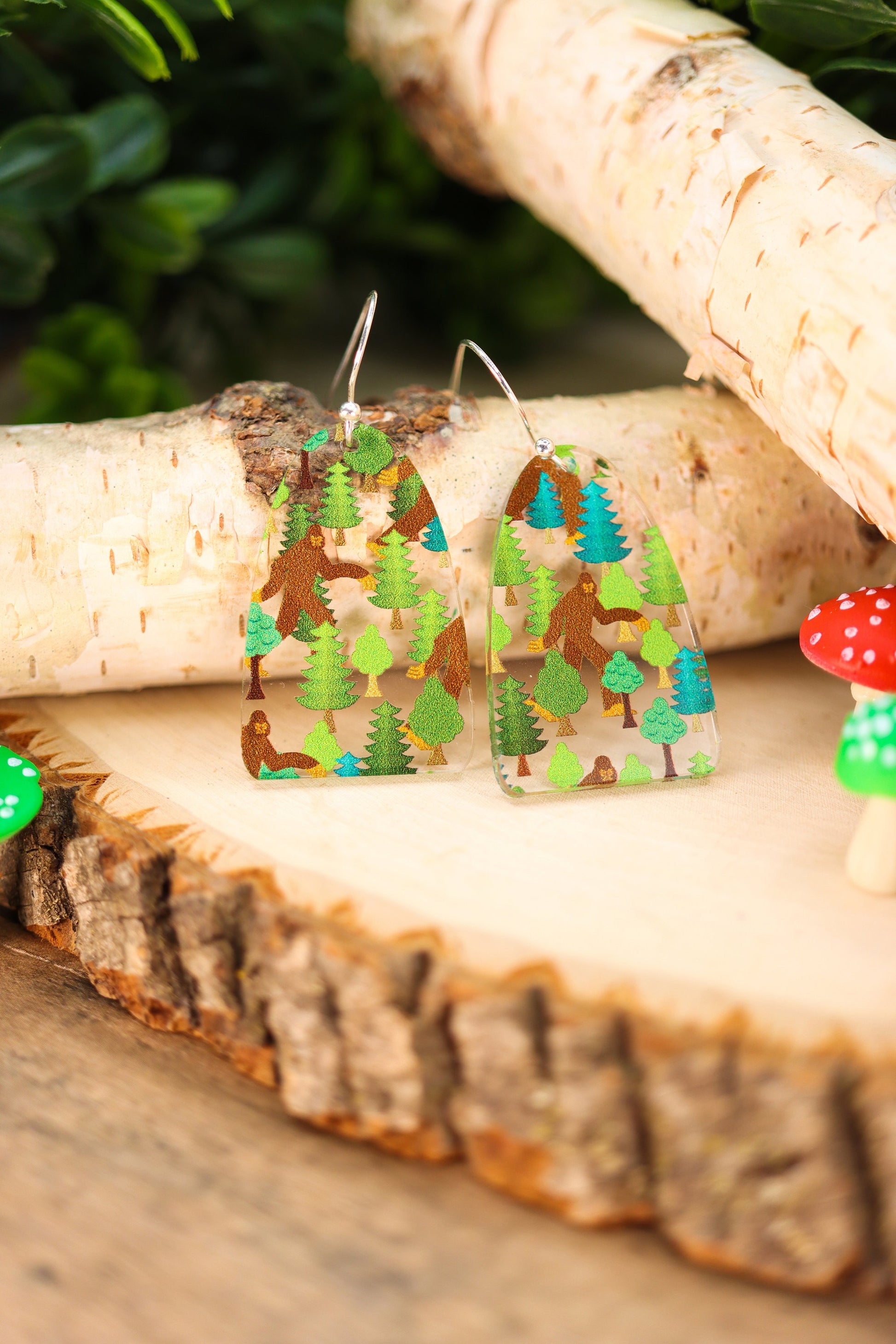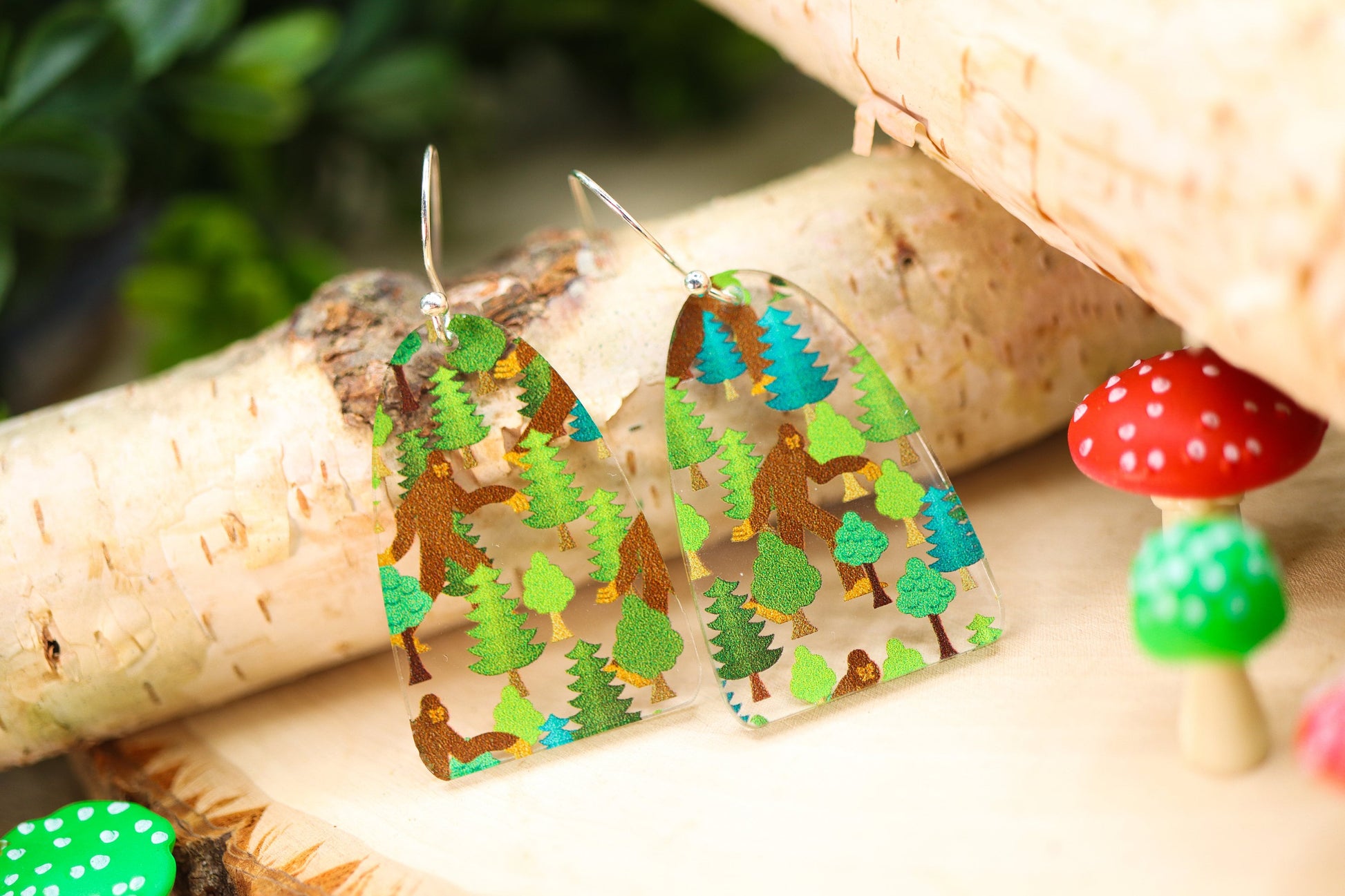 The perfect gift for any cryptid-lover, these adorable earrings match any Bigfoot-spotting outfit! Bigfoot hides in the printed acrylic pieces which hang from hypoallergenic silver tone earring wires.