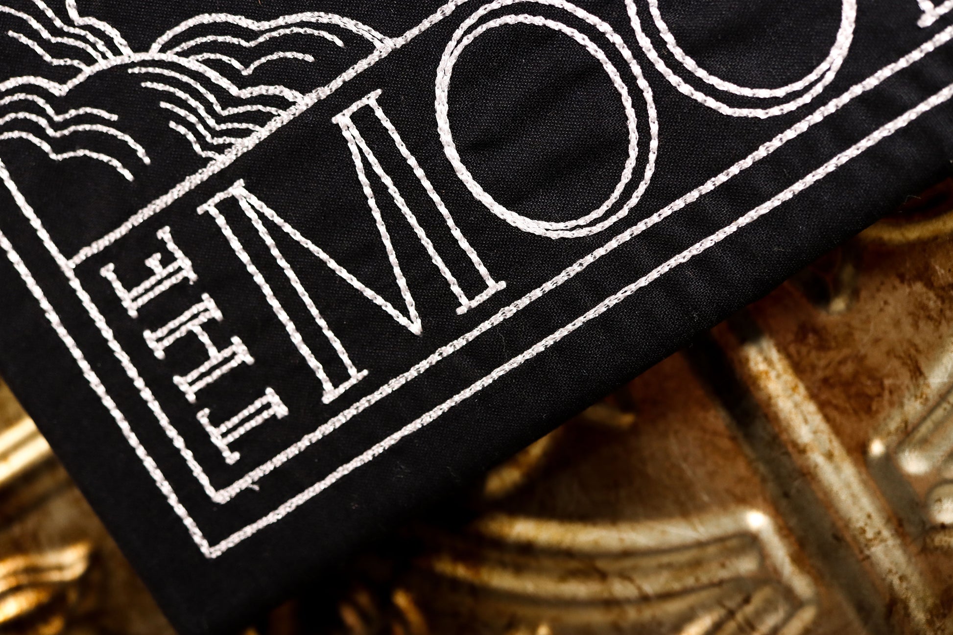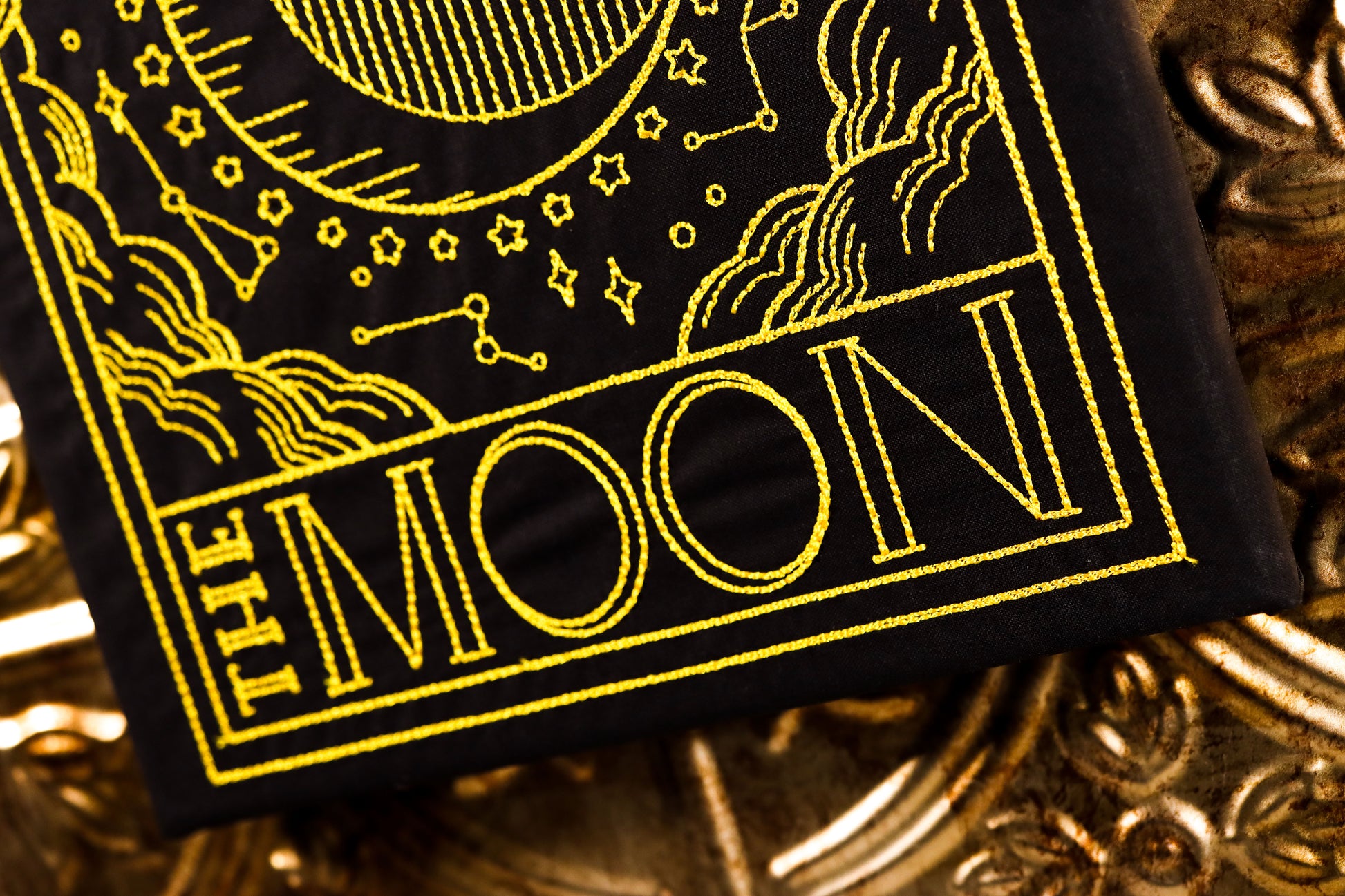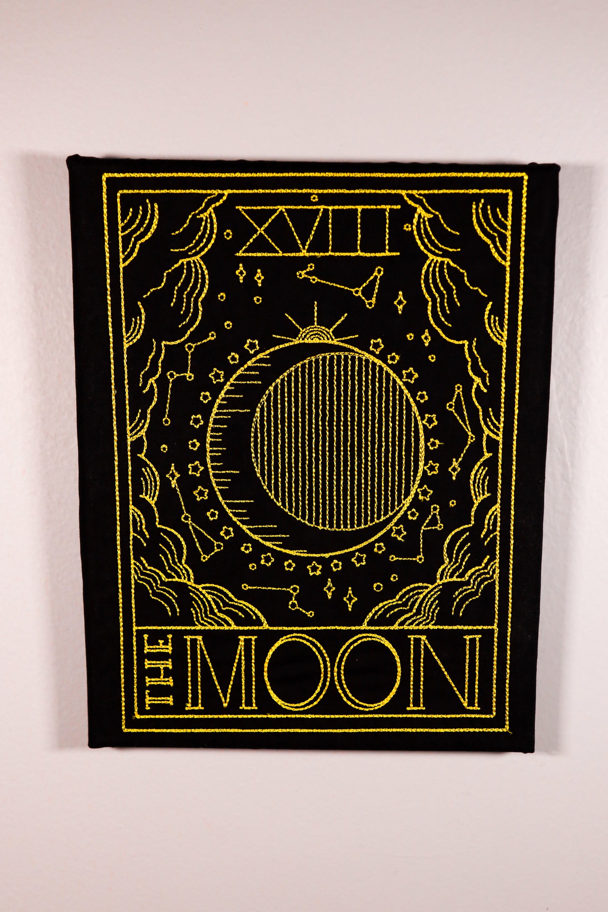 Emblazoned with a stylized version of a Moon Tarot card, this 8 x 10 canvas embroidery is the perfect piece for any home! Available in white or yellow stitching, this art piece comes ready to hang and is embroidered on high-quality black cotton.
