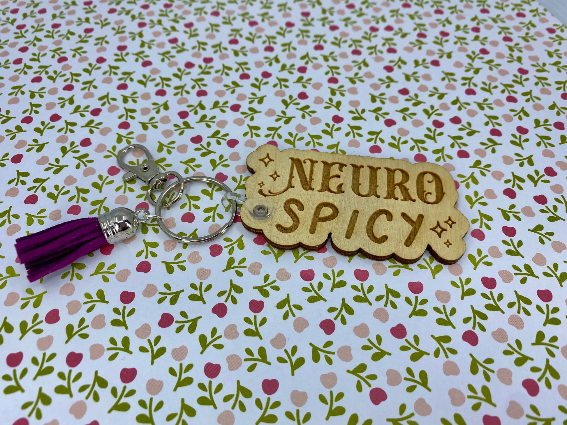 Laser engraved on 1/8 in birch, this keychain declares to the world that you're not just neurodivergent, you're Neuro Spicy.