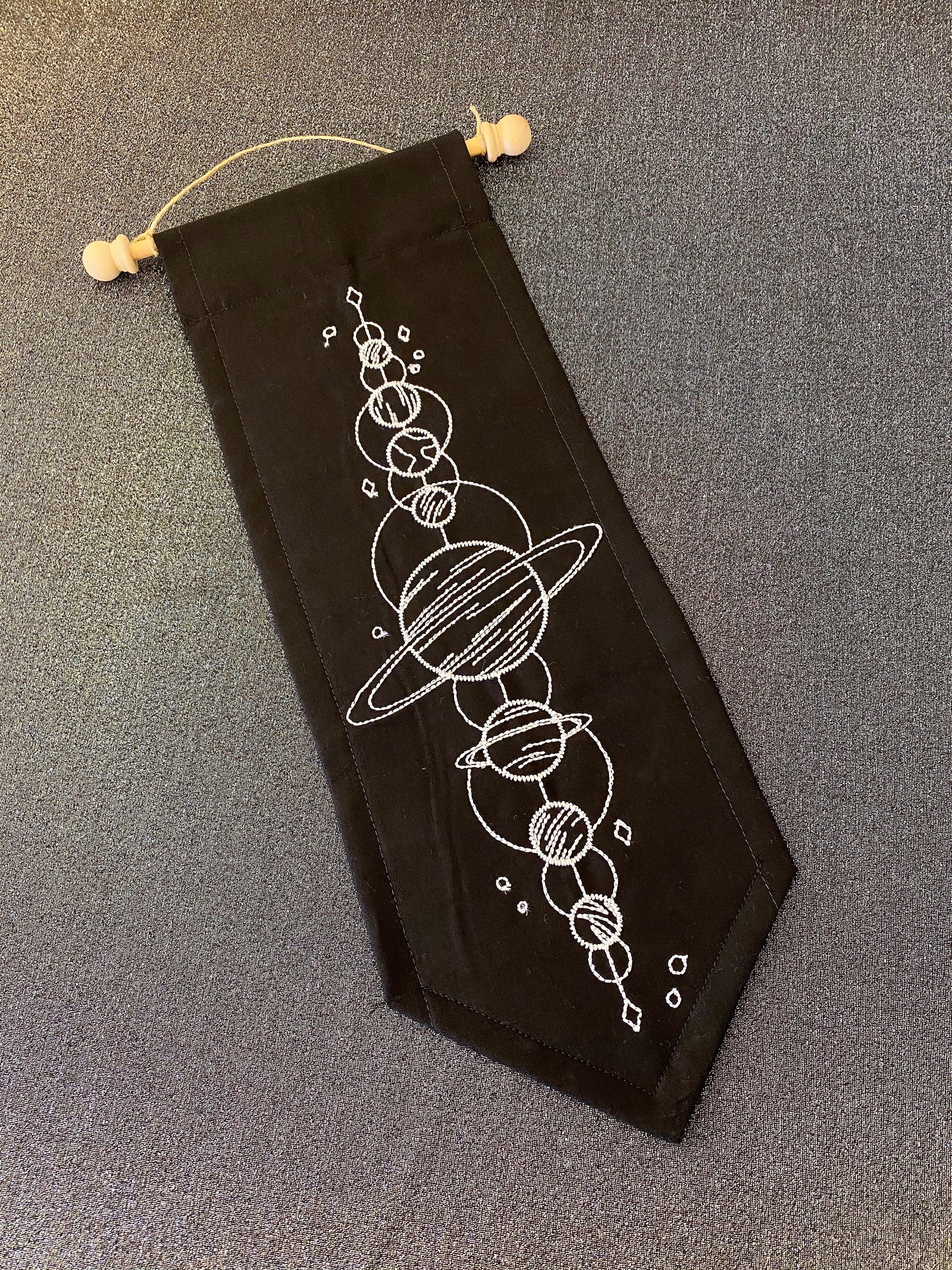 All the planets align just for your decor in our Planetary Banner! Embroidered in white thread on high-quality black cotton, the alignment of the planets are surrounded by stars in this beautiful pattern. This banner is the perfect house-warming gift for any stargazer; it comes ready to hang with a natural wood dowel and twine hanger.