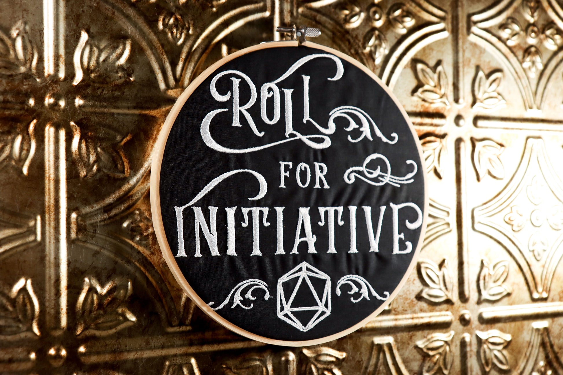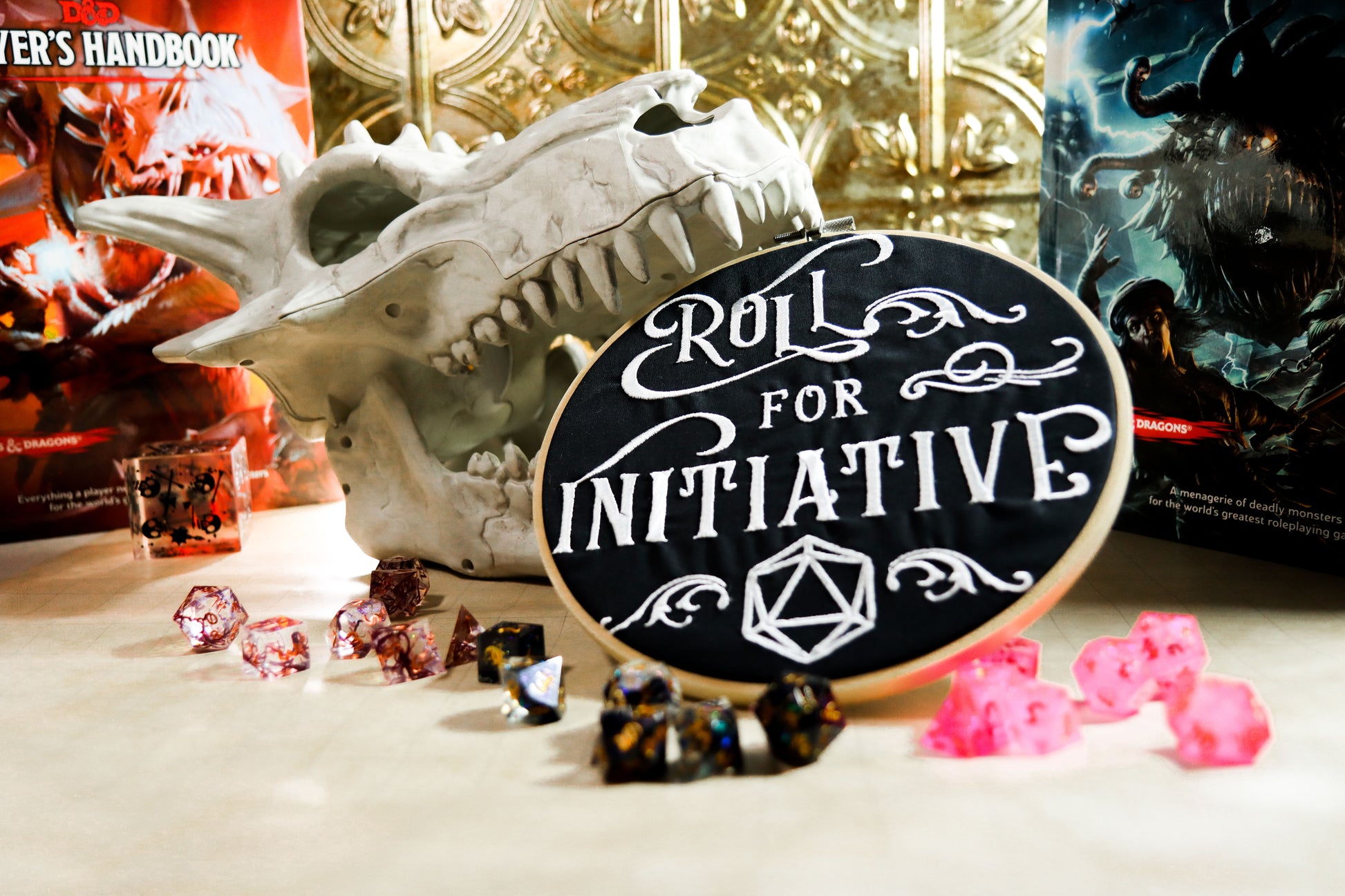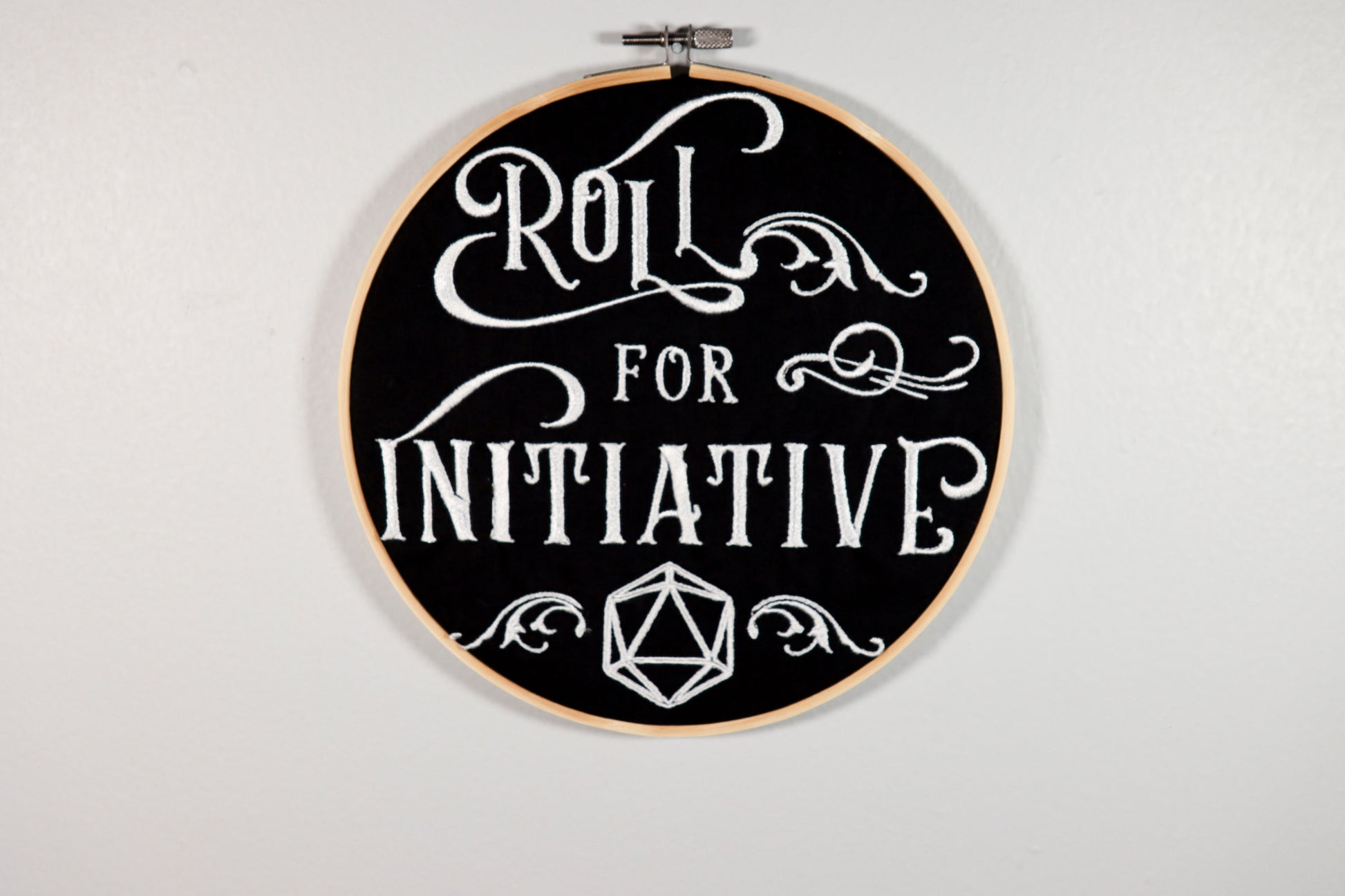 Perfect for game rooms and tables of all kinds, our original Roll For Initiative embroidery hoop design fits your game room aesthetic. Available in a rainbow of colors, and classic black and white, this hoop is sure to entertain your guests, NPCs, and adventurers alike!